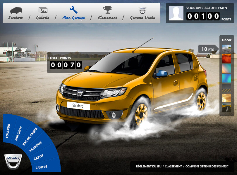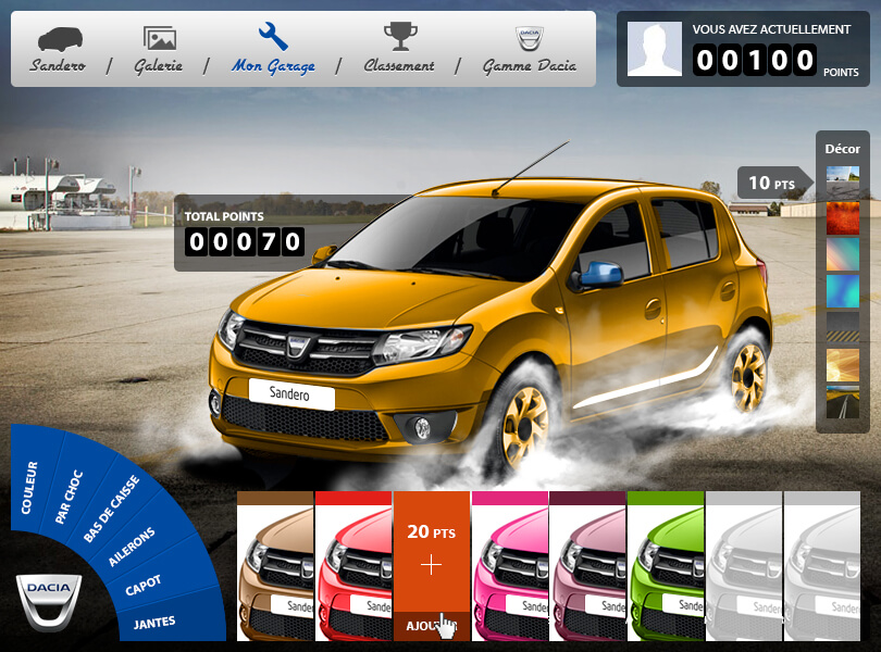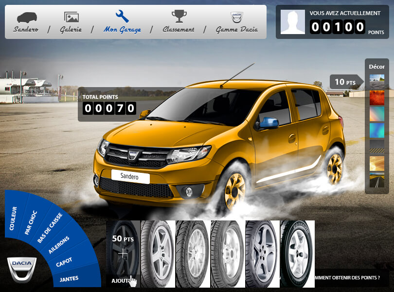 Face à la demande croissante des internautes et dans le cadre du mois de Ramadan, nous avons imaginé une campagne unique qui permettrait aux amateurs de personnalisation automobile de se connecter davantage avec la marque Dacia. Le concept était de créer un jeu Facebook où les participants pourraient personnaliser virtuellement des véhicules Dacia en utilisant des kits de carrosserie et des autocollants, offrant ainsi une expérience de tuning virtuel amusante et engageante.